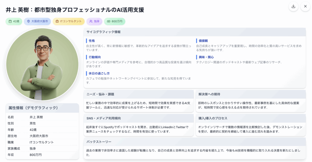 従来のペルソナ設計は属人化しやすく、時間や経験に依存していたという課題がありました。BuzzCityの導入により、ペルソナ設計やリサーチにかかる時間を大幅に削減し、誰でも”当事者目線”で提案をつくれる環境を実現します。また、デザイン性の高いペルソナカードは資料への転用もしやすく、提案の説得力を高められます。