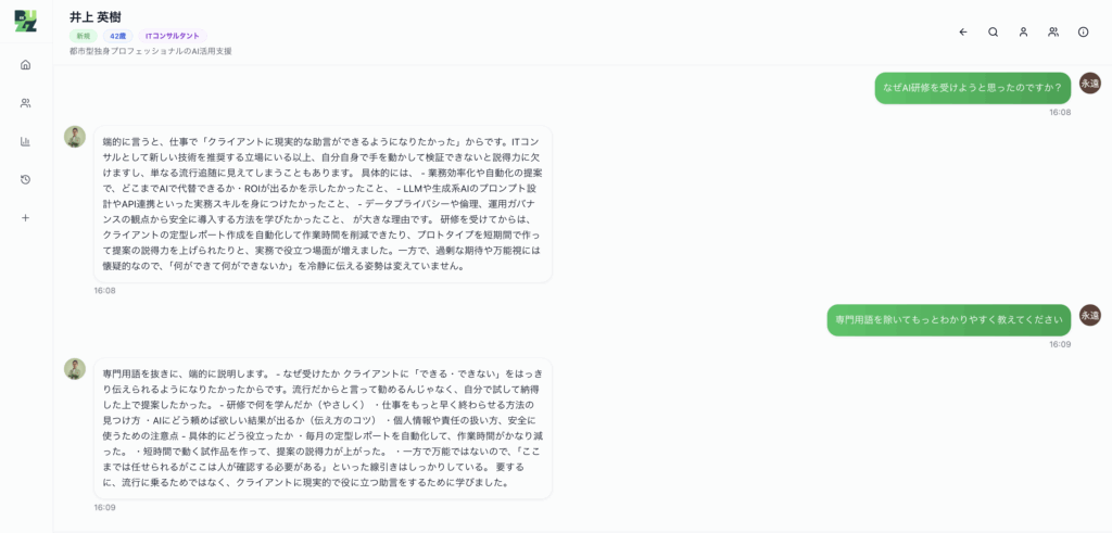 本ツールは、商品・サービス情報を入力するだけで複数のペルソナを自動生成し、それらのペルソナと“対話”を行うことで、購買意欲や本音を直接ヒアリングできるN=1インタビュー体験を再現します。